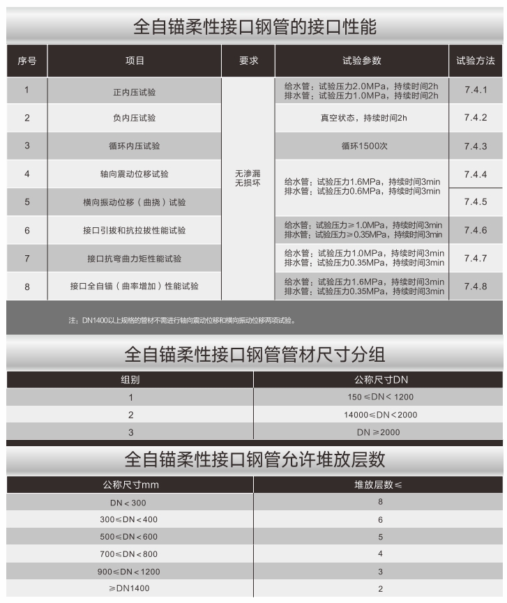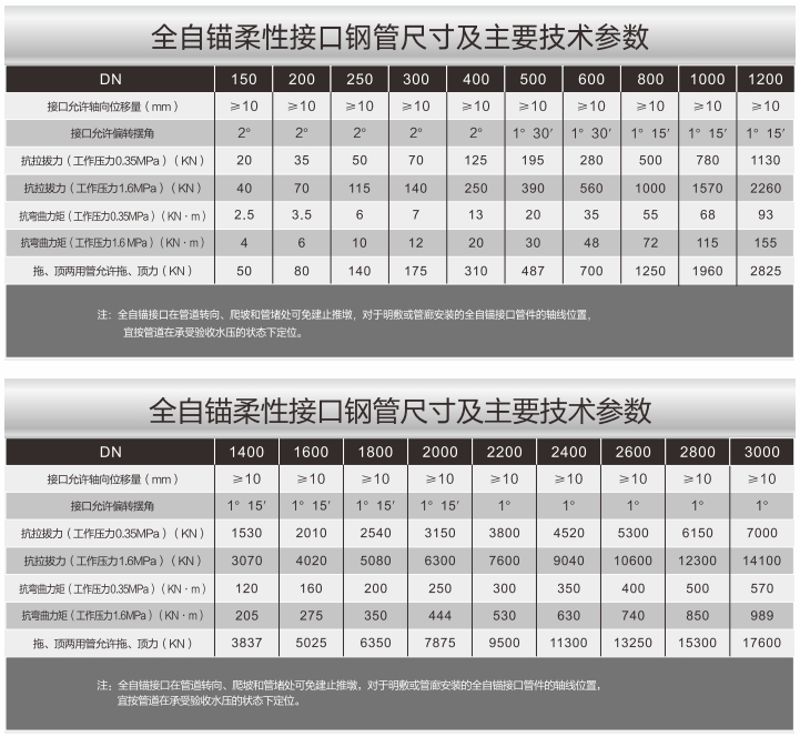 ①全自錨(抗震型)柔性接口鋼管不但具有防止軸向拉脫和橫向彎曲脫口的全方位自錨功能,而且還可通過(guò)接口的傳力,令管道可通過(guò)連續(xù)疊加多個(gè)接口的可移量,增加管道的位移量和管線變化的曲率,適應(yīng)管線更大的不均勻沉降和變化,成為可安全跟隨地面位移和地形變化防止接口滑脫的管型。